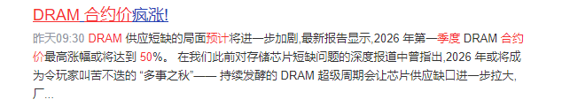 報告顯示,DRAM(動態(tài)隨機存取存儲器)的合同價格預(yù)計在本季度(2026年 Q1)將暴漲 50%。這不僅僅是“漲價”,而是“價格休克”。